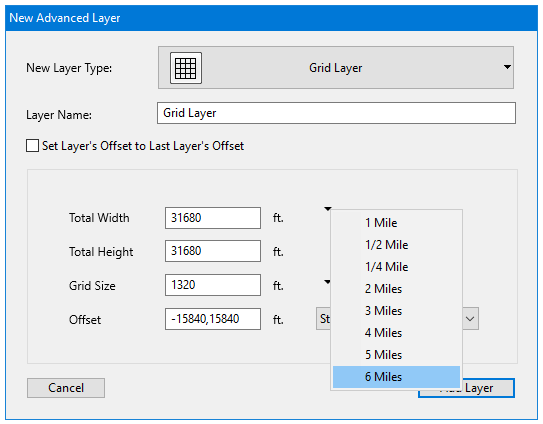 To create a 6x6 grid, click on the popup menu widget and select 6 Miles. The form will populate with the following information: